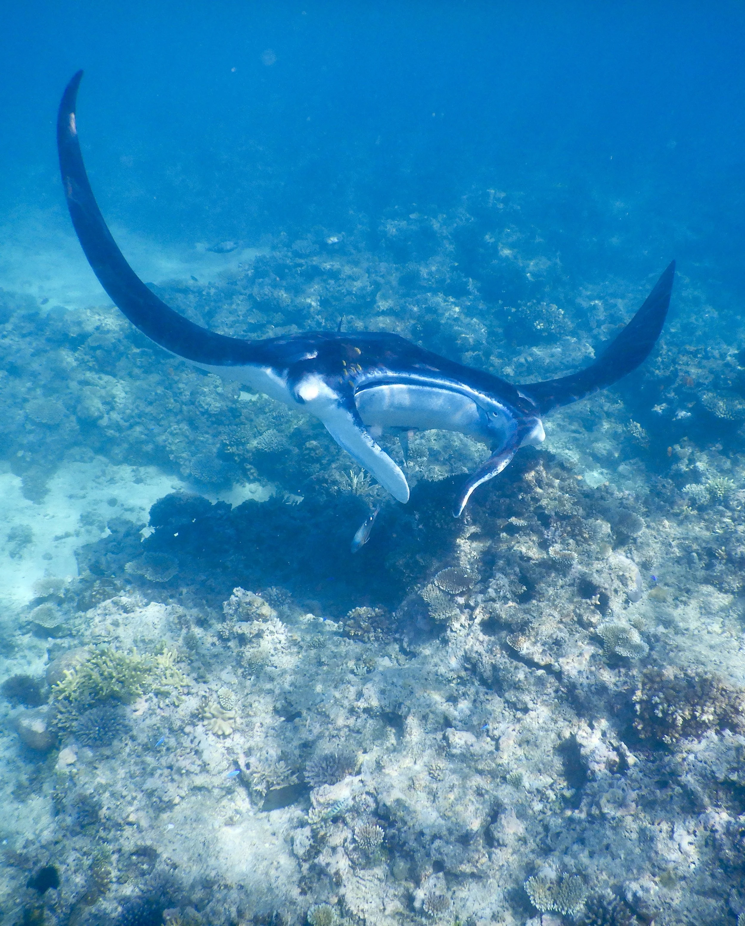 We snorkeled off Buliya Island where huge Manta Rays hunt for food close to the surface. Aside from the awesome spectacle of these magnificent creatures gracefully swooping and swirling mere meters below us as we watched on in amazement, I also spotted an octopus chilling on the reef, his skin pattern blending in so well with the plateau that you really needed to know where he was to see him.