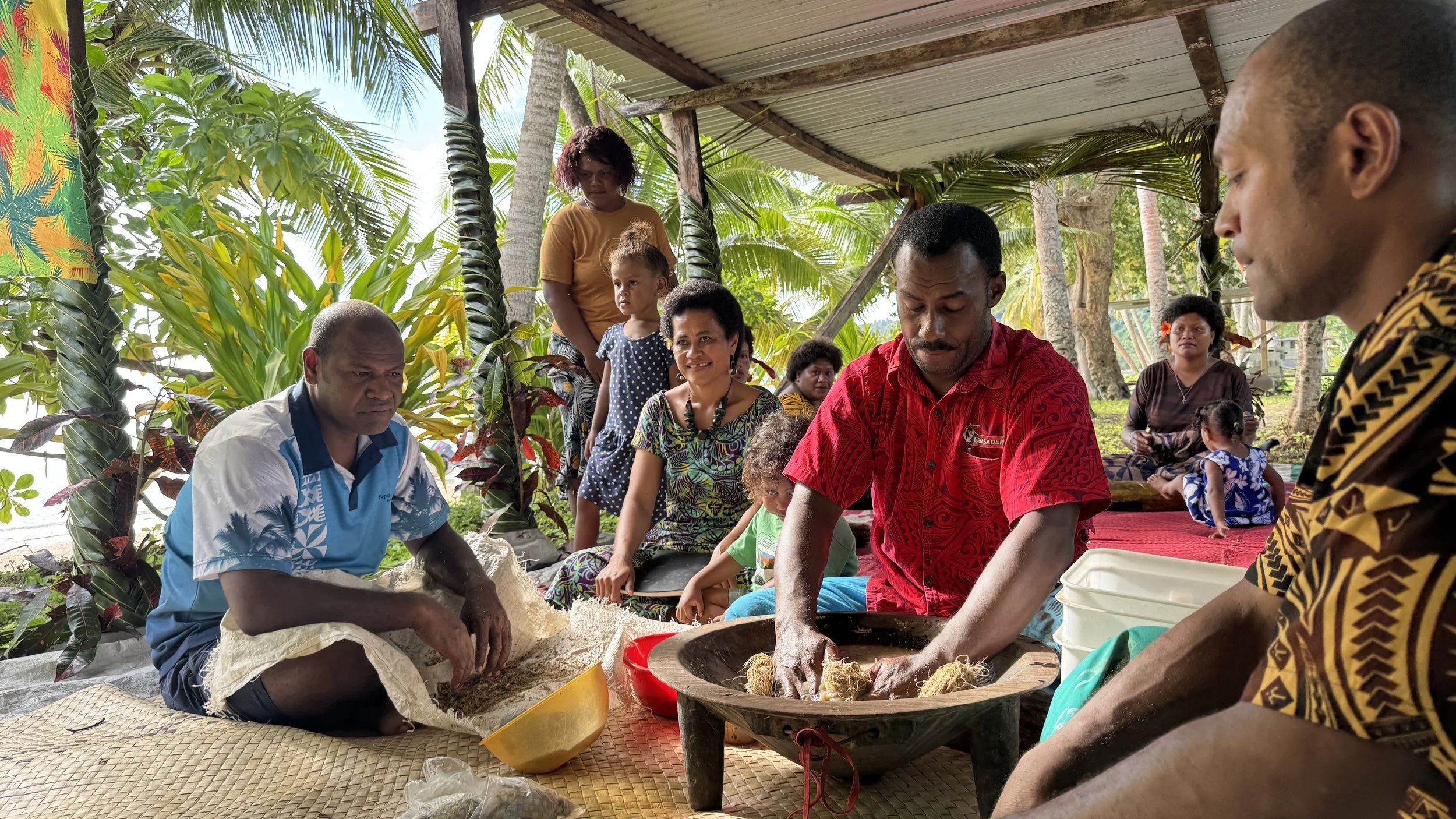 Fiber from the base of the leaves of a coconut palm is used to strain the kava. The oft-used strainer is passed down from generation to generation of kava masters.