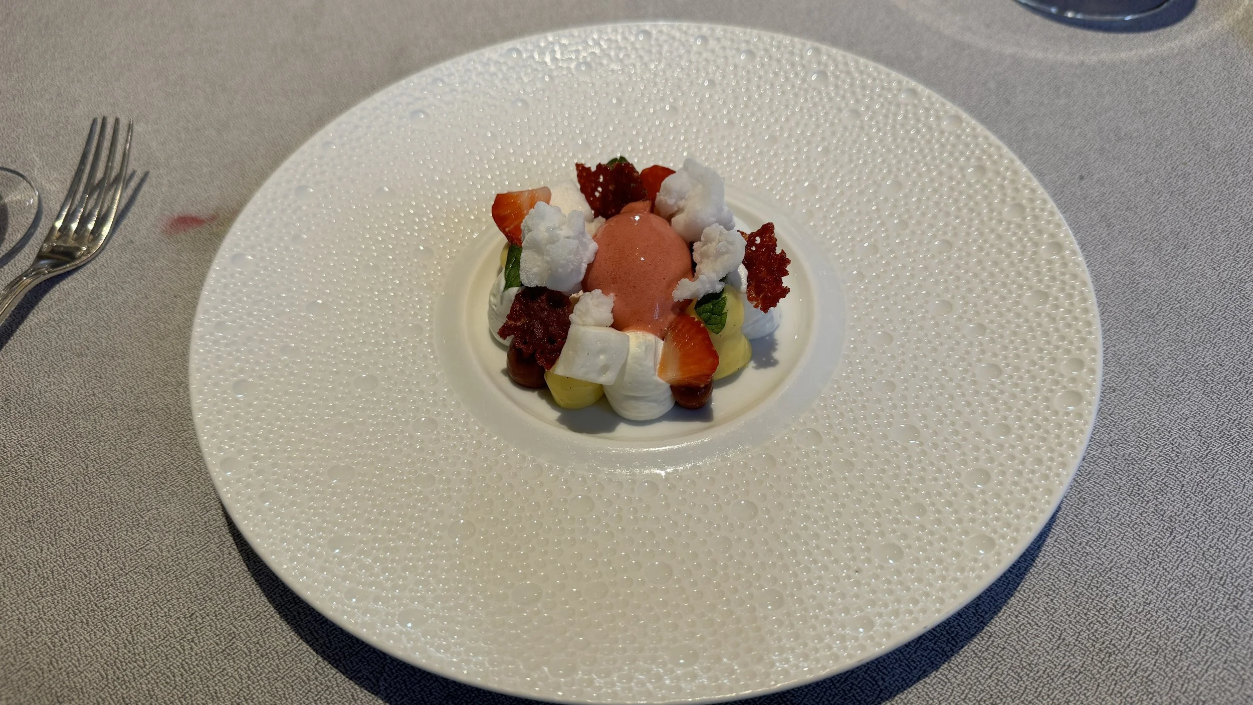 Interestingly, we were seated around a large round table with Randy nearly to my side, not across. All the tables in our room were handled that way, and it gave us lots of space and always facing the waiters when they explained our next course.