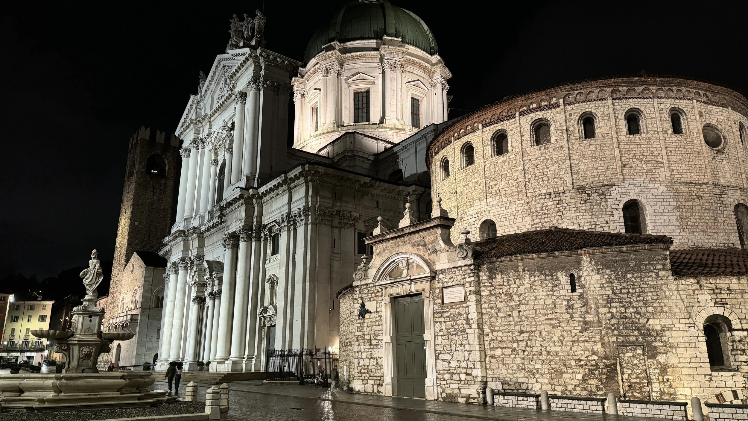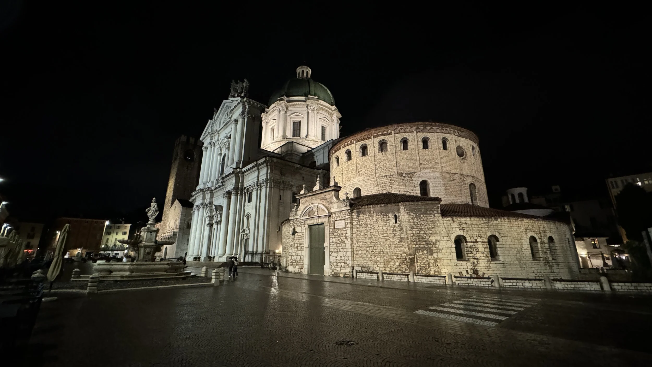 Duomo Vecchio di Brescia and Duomo Nuovo at night in Piazza Paolo VI