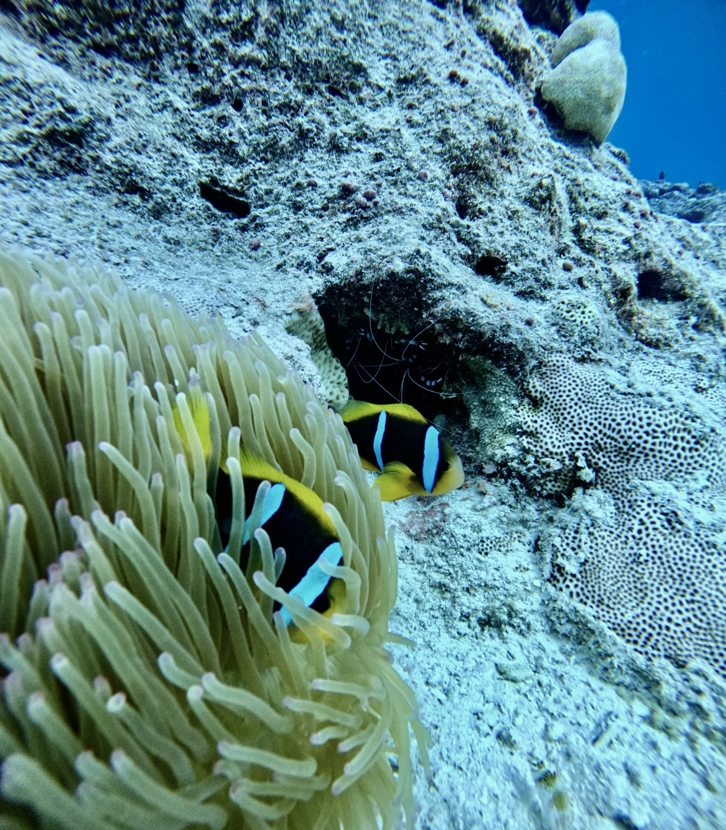 Clownfish in anemone with banded coral shrimp hiding in a little cave behind