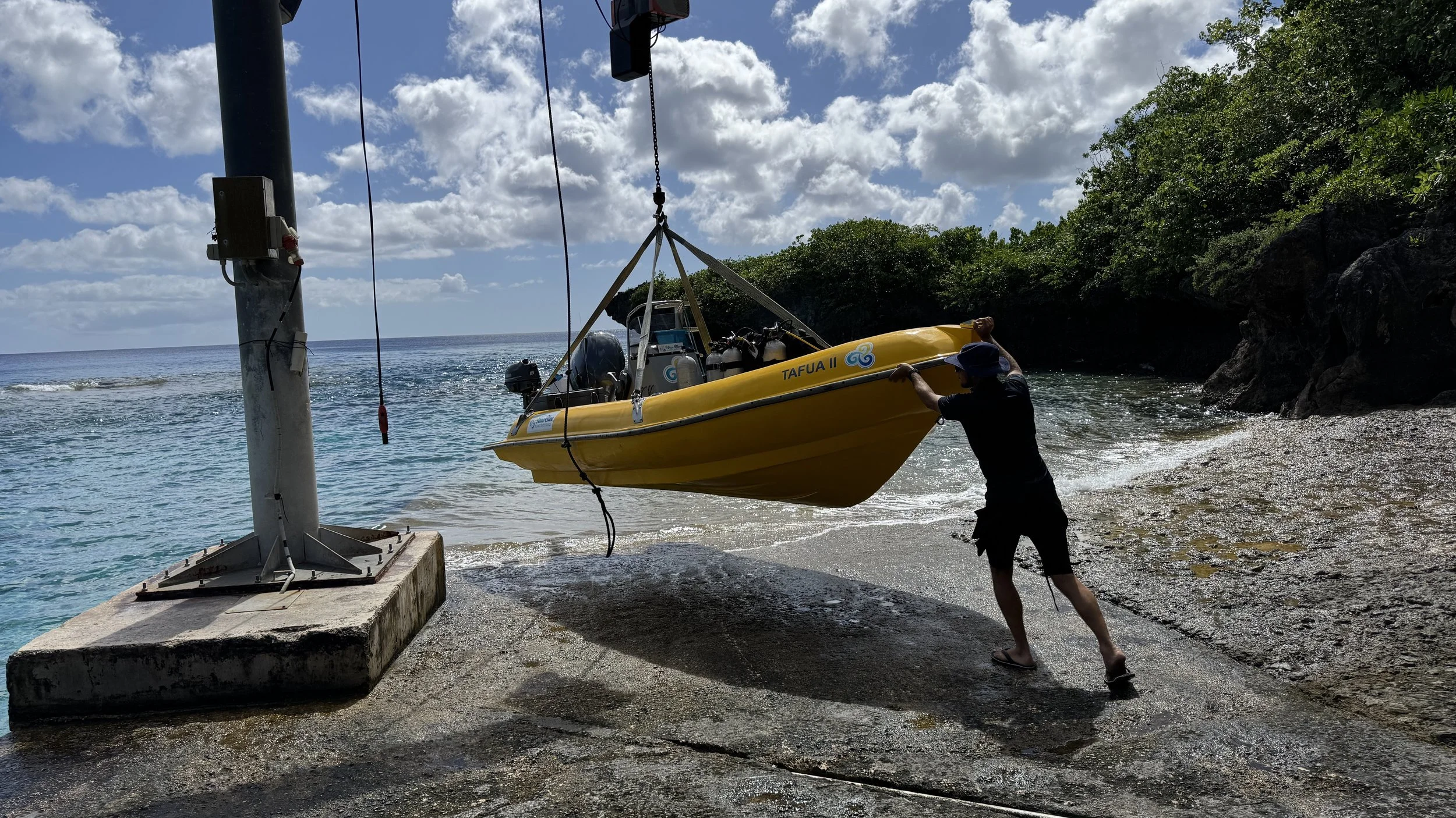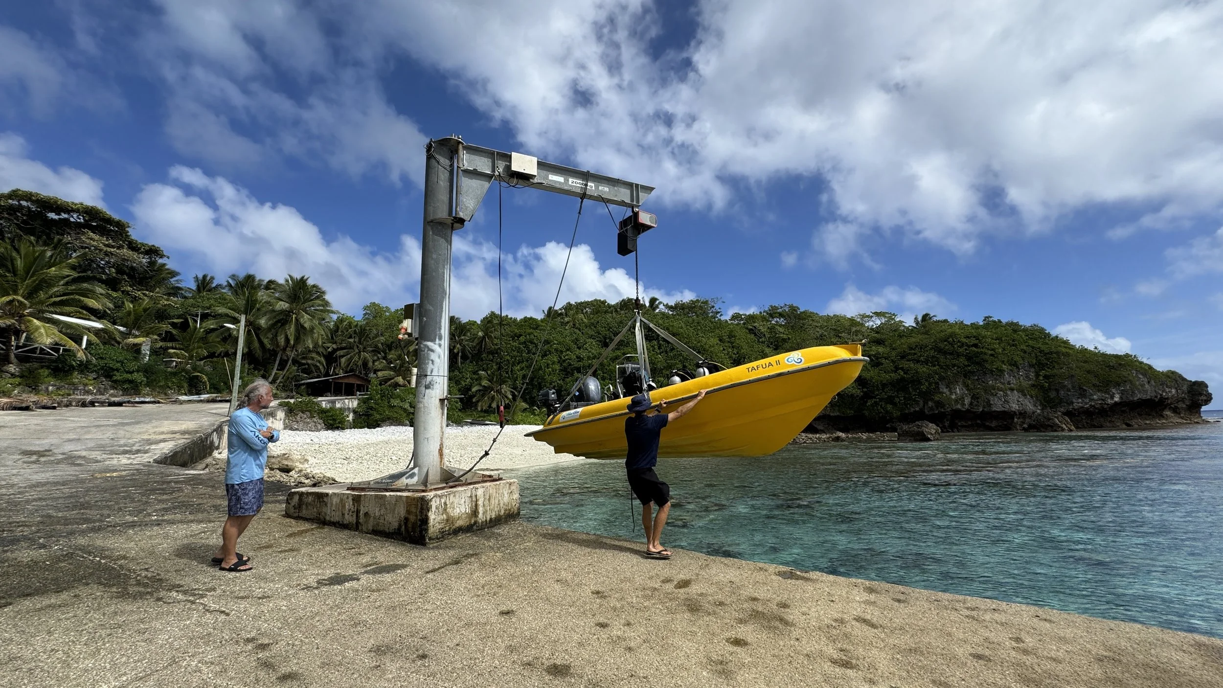A container ship brings non-essential food items and other necessities every 5 weeks. Due to weather conditions, delays of up to 3 weeks are possible, causing stocks to dwindle. Because of the limestone shelf surrounding the island, the wares are tendered from the container ship and unloaded with a crane at Sir Robert’s Wharf, named after Robert Rex, the first Premier of Niue one hundred years ago. The container ship crew have to wait for calm seas before transferring the container goods ashore.