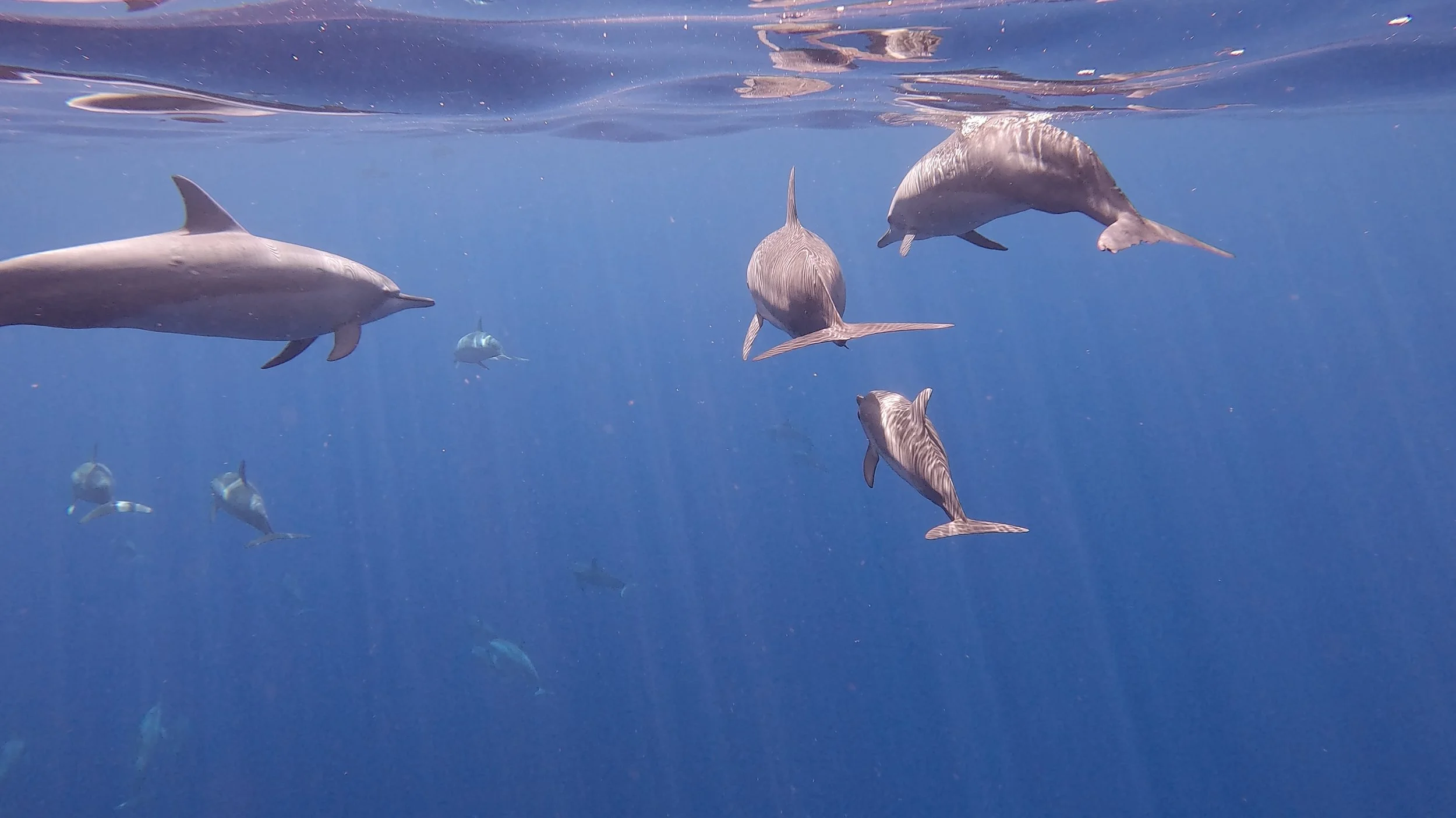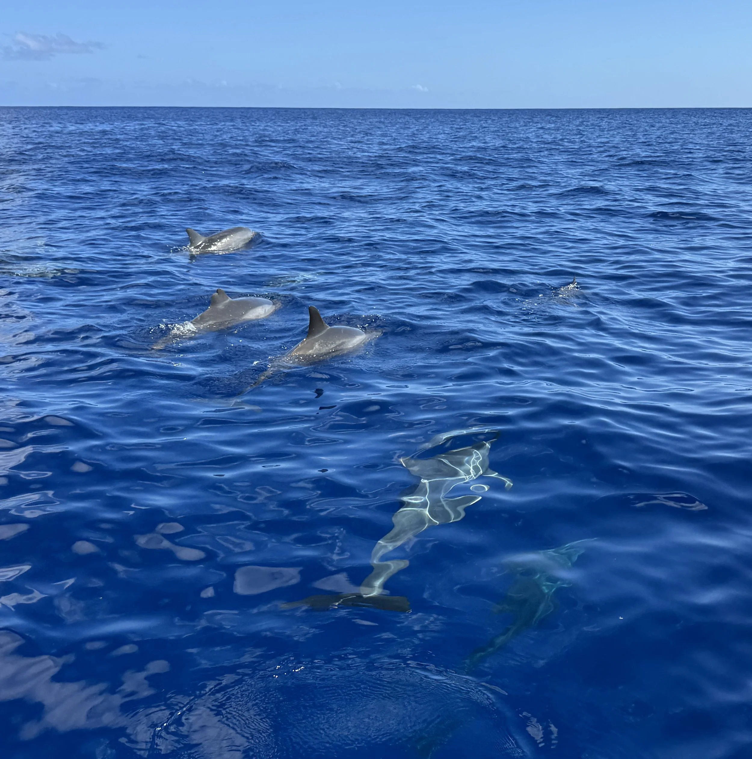 A pod of about thirty dolphins roam the west coast of Niue and love to interact with dive boats. We were so lucky on our second dive trip that, Flo, our divemaster guide, clipped ropes with handles from the sides of our boat and Gitty and I floated along in the water with our dive masks and snorkels as the boat slowly dragged us along with the dolphins and their offspring swimming in front of us, around us and below us in the most amazing dolphin encounter ever.