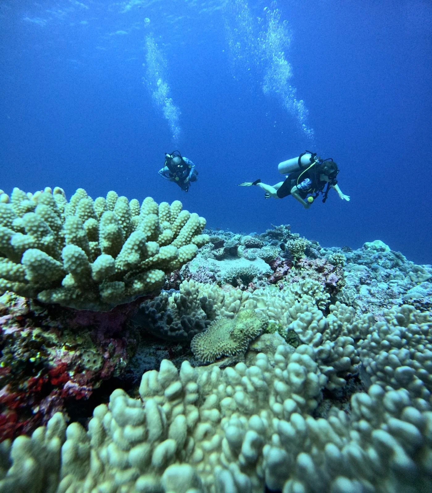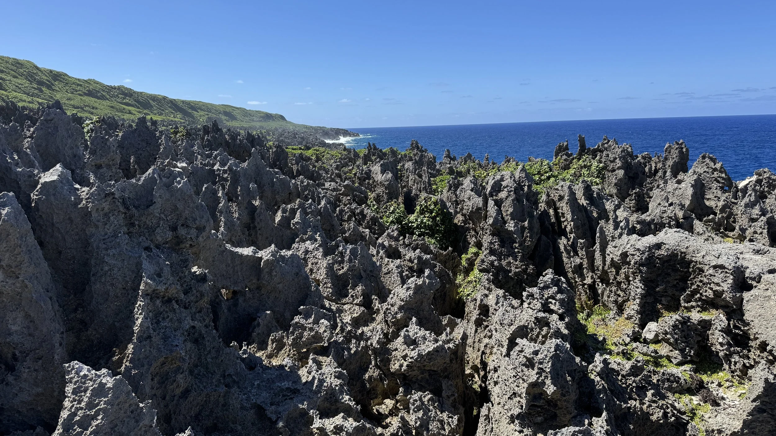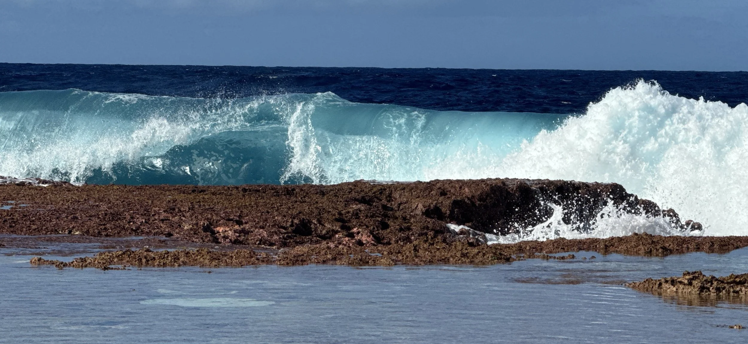 The limestone shelf, formed around the island when part of the atoll was briefly submerged, geologically speaking, is now creating striking impressions, at even low tide, of crashing waves in shades of aqua and cerulean against the plateau overgrown with hard rock corals and natural pools and volcanic ridges.