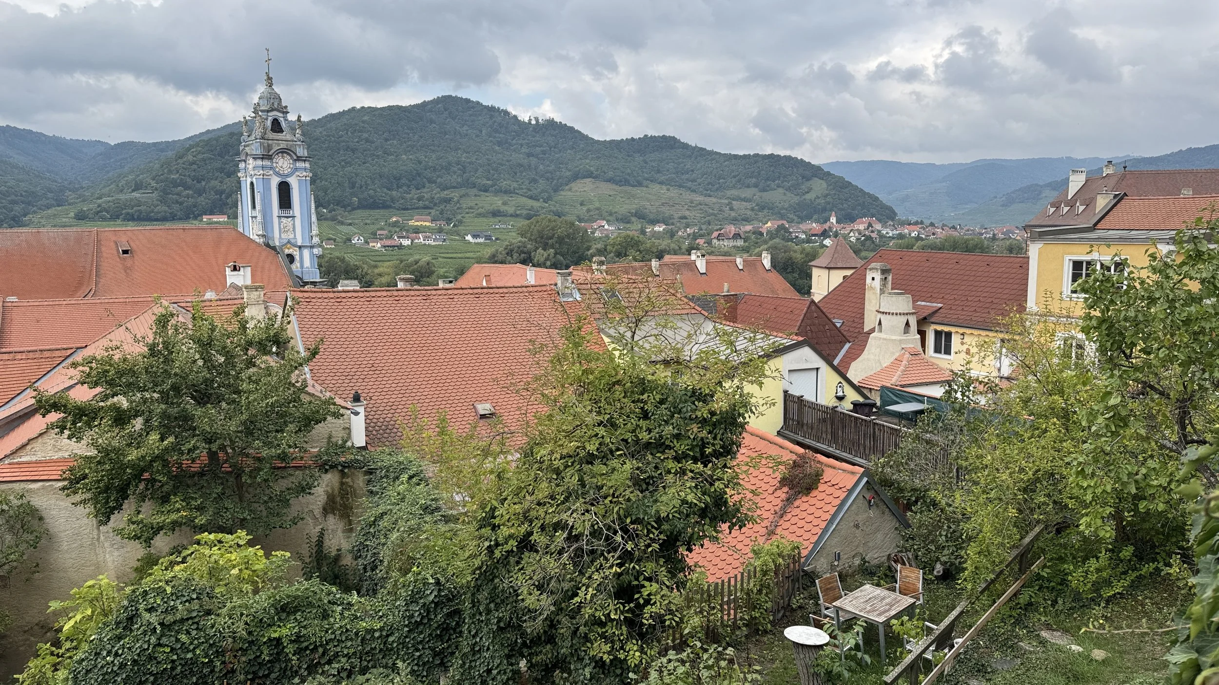The distinctive blue church tower of Dürnstein Abbey over the rooftops