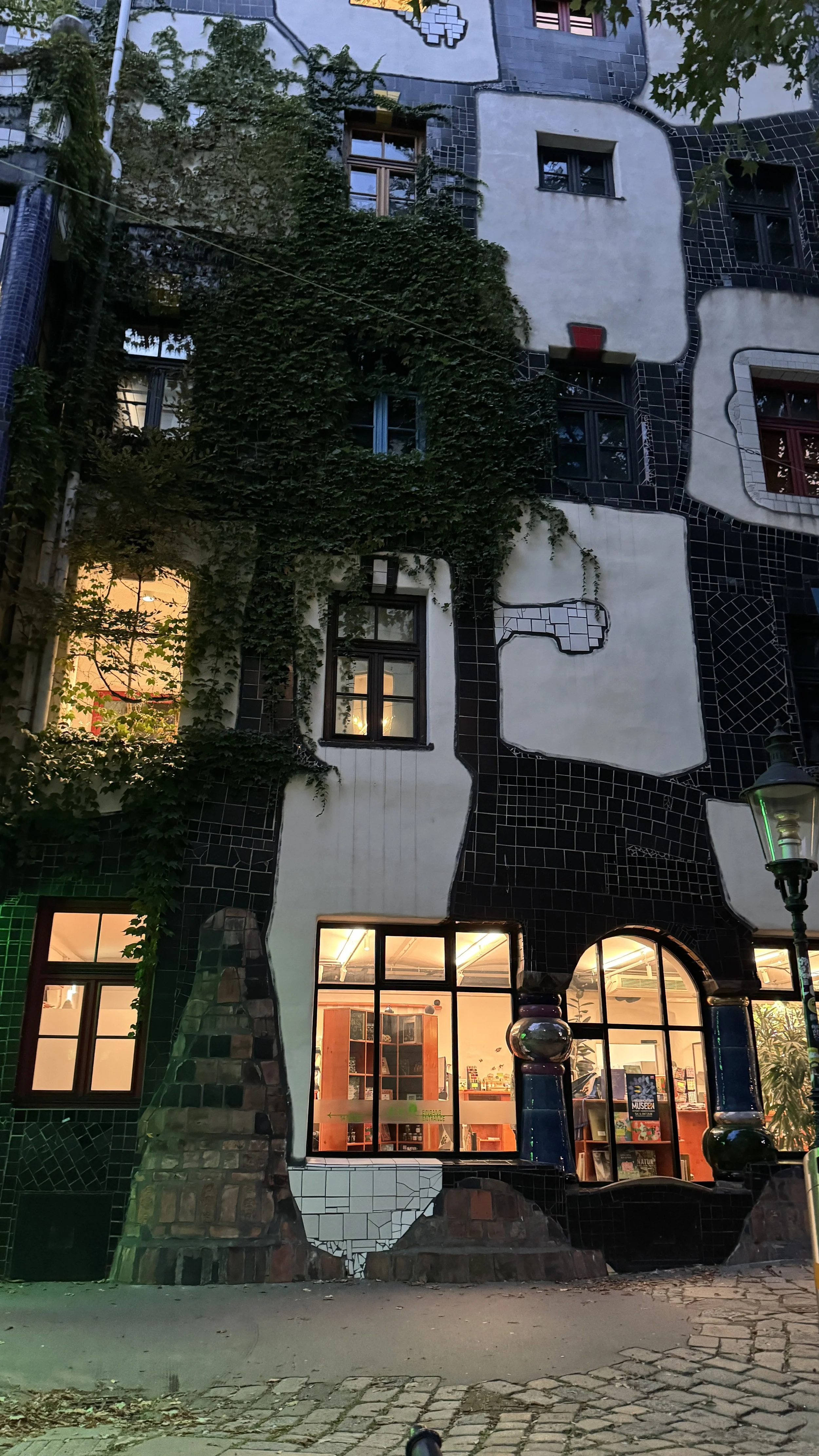 We also visited the Hundertwasser Museum. Friedensreich Hundertwasser, a visionary Viennese artist and architect who captured my imagination when I saw him live on TV at the age of 13, denounced dull, bland white facades in lieu of colorful, fluid designs to interrupt static and lifeless geometric architectural forms. He fascinated me all my life, and 20 years later, I saw him during my first visit to Vienna, finishing up construction of the famous Hundertwasserhouse, an affordable housing complex commissioned by the city of Vienna.