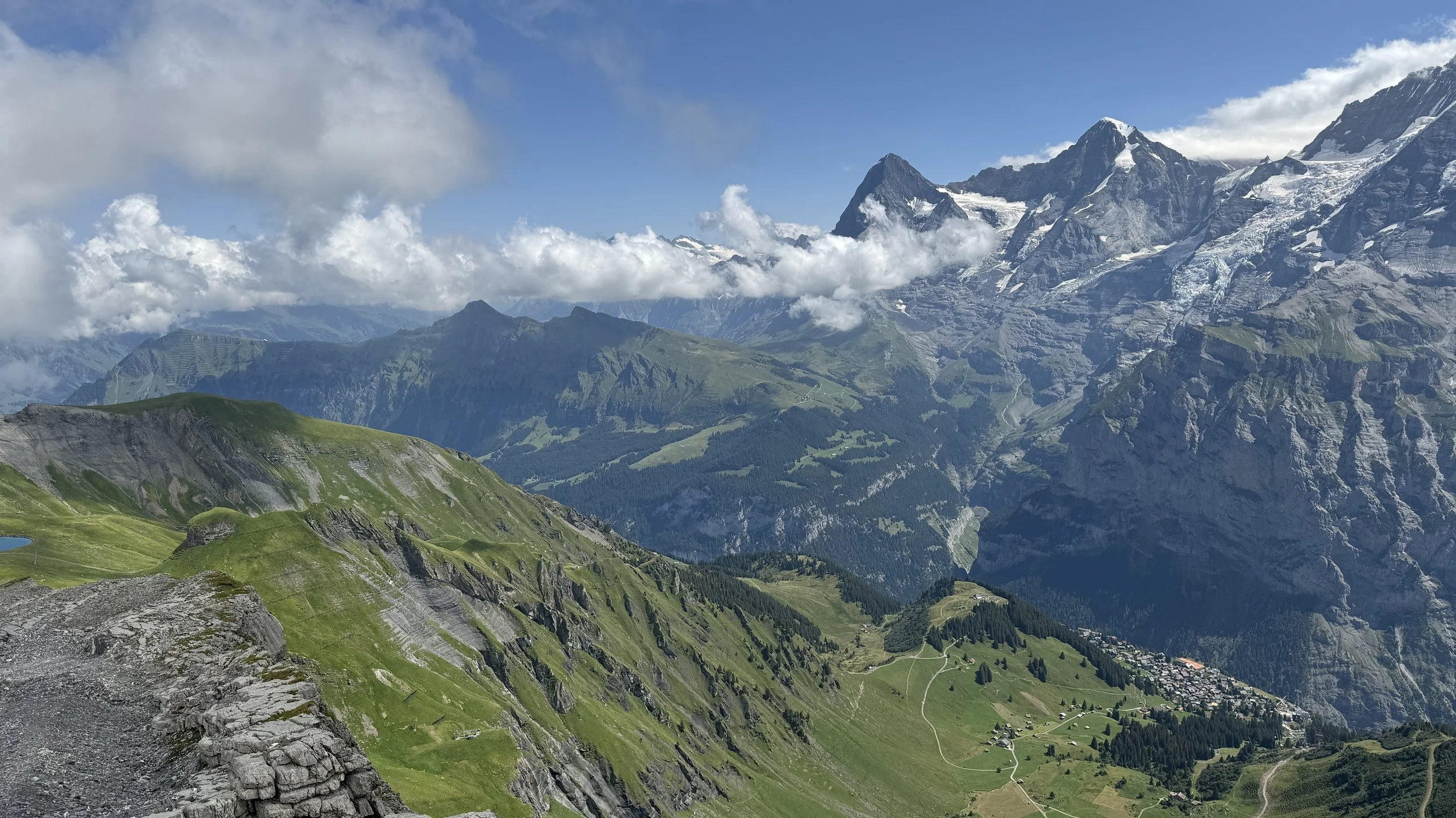 Mürren seen from the Sky Line walk at Birg with the massive Eiger as backdrop