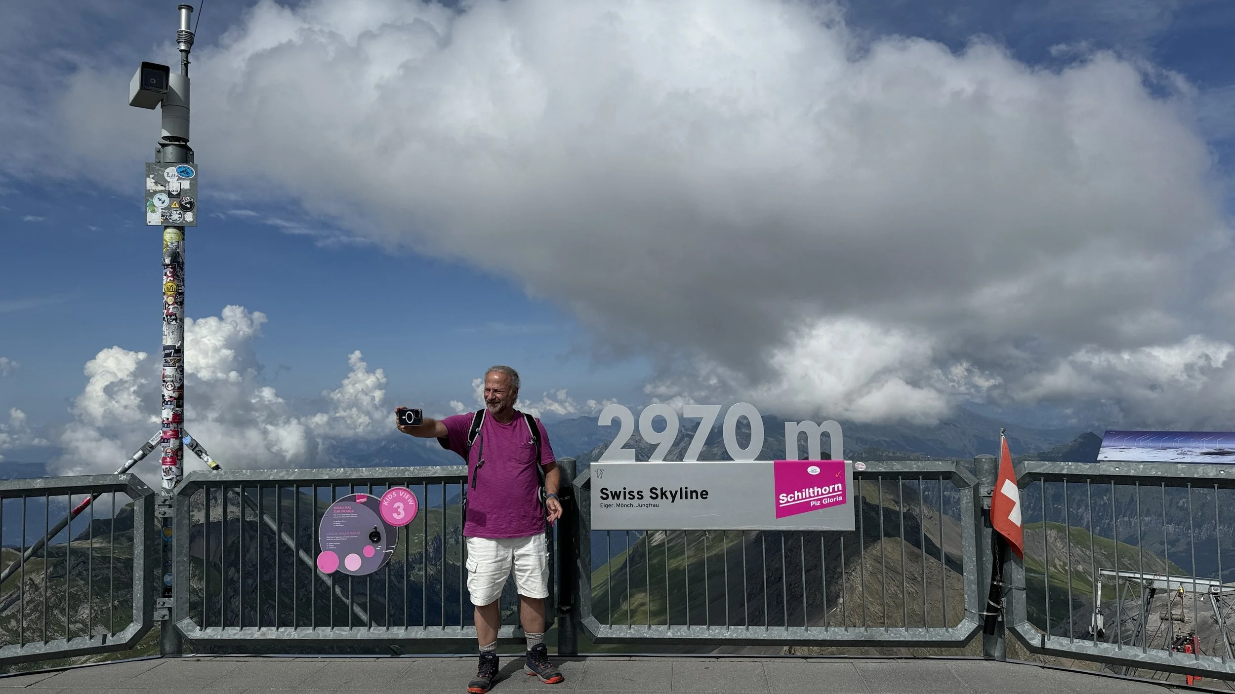 Randy taking a selfie at the outdoor deck of Piz Gloria on Shilthorn peak