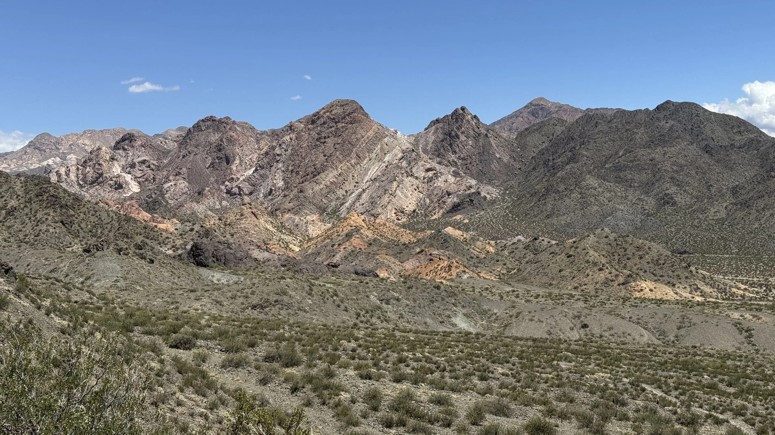 There are no trees, just low bushes, and the rock strata appear as broken-up layers of varying colors, formed when the Andes were created 200 million years ago through the collision of two continental plates. As in the Alps in Europe, there is not just one mountain range but so many, separated by valleys, often containing only a creek or patches of compact green shrubbery. Driving along the highway, we encountered long stretches of bare rock, without villages, streets, or hiking trails, which I found rather unusual. Just nature, seemingly untouched.