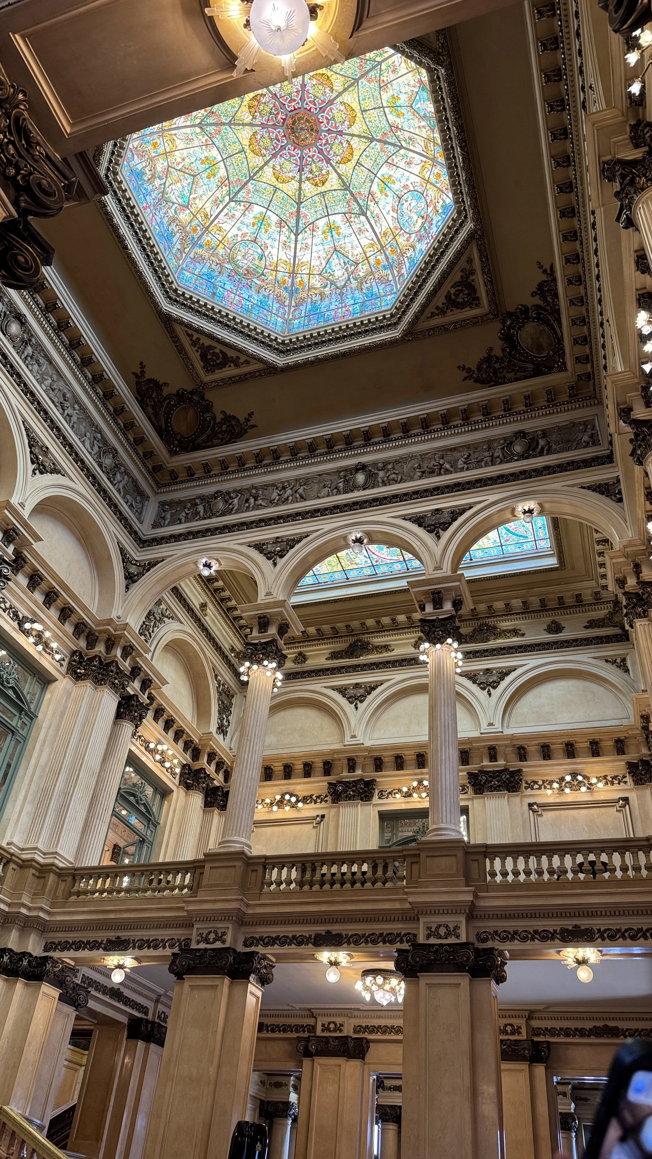 Inside lobby of the Teatro Colón, the opera house feels grand, ornate, and unmistakably European.