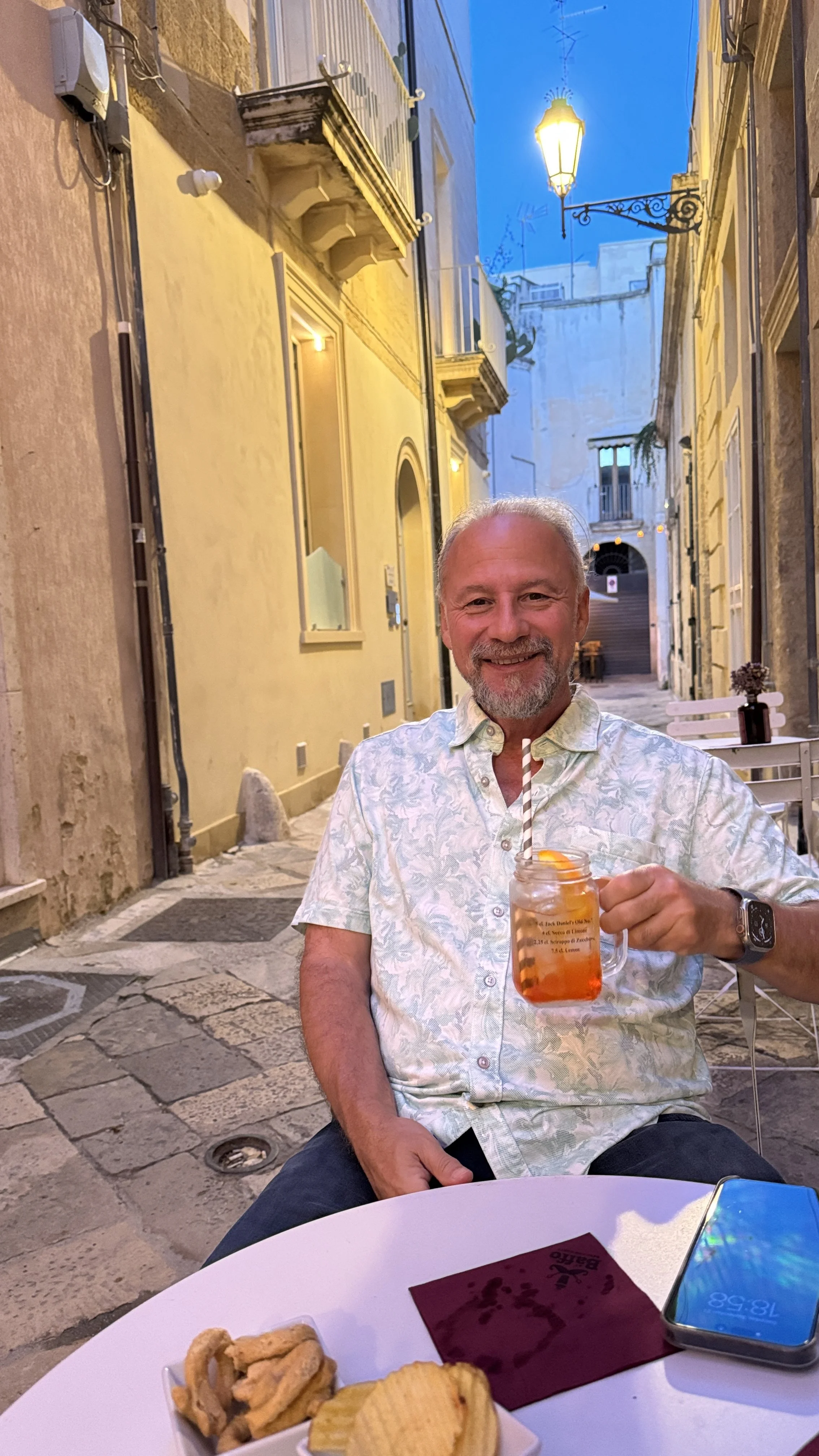 Enjoying an Aperol Spritz in Lecce on the first night in Puglia before our walking tour began.