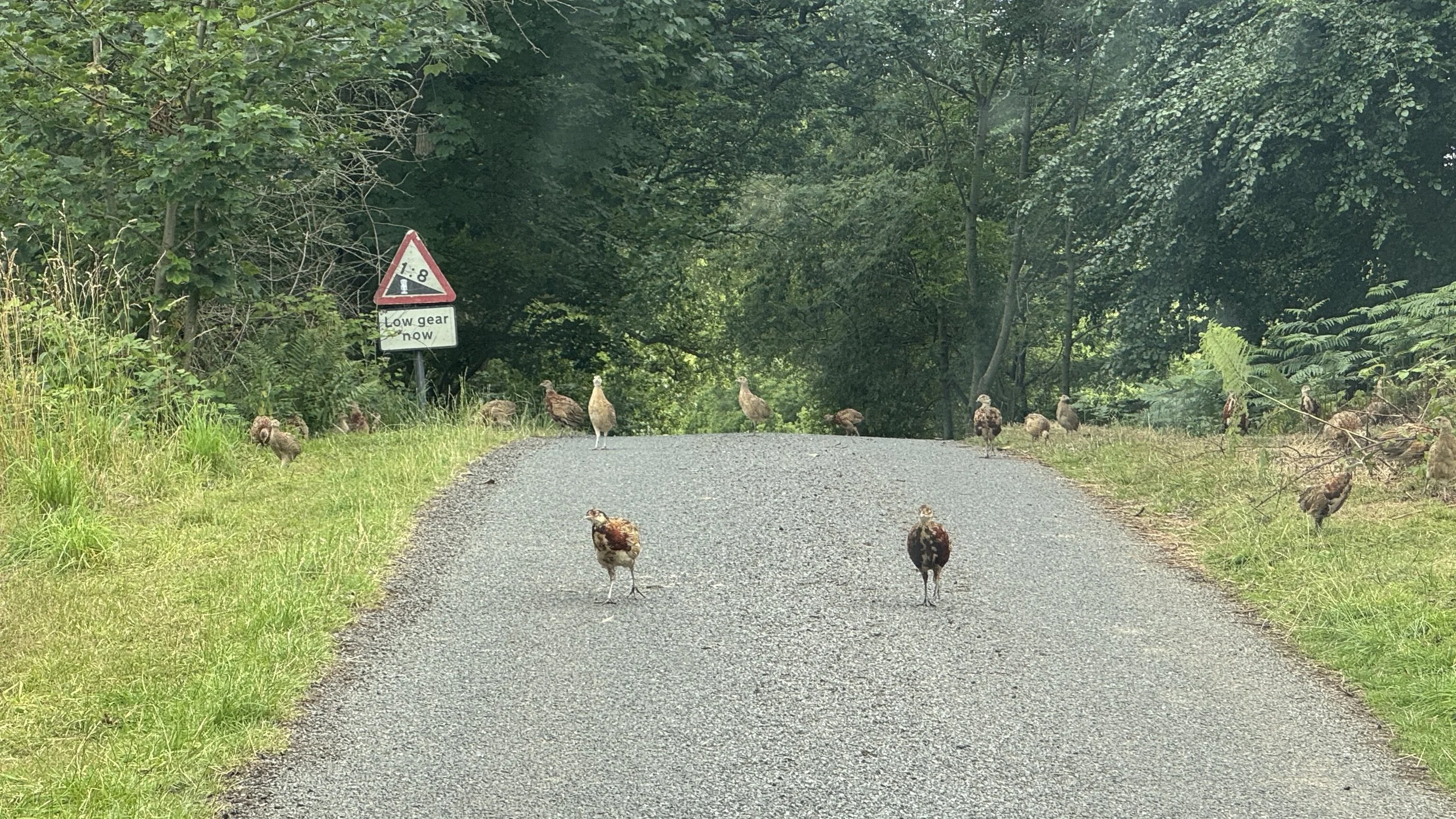Partridges blocked the road so Gitty had to leave the car to shoo them away