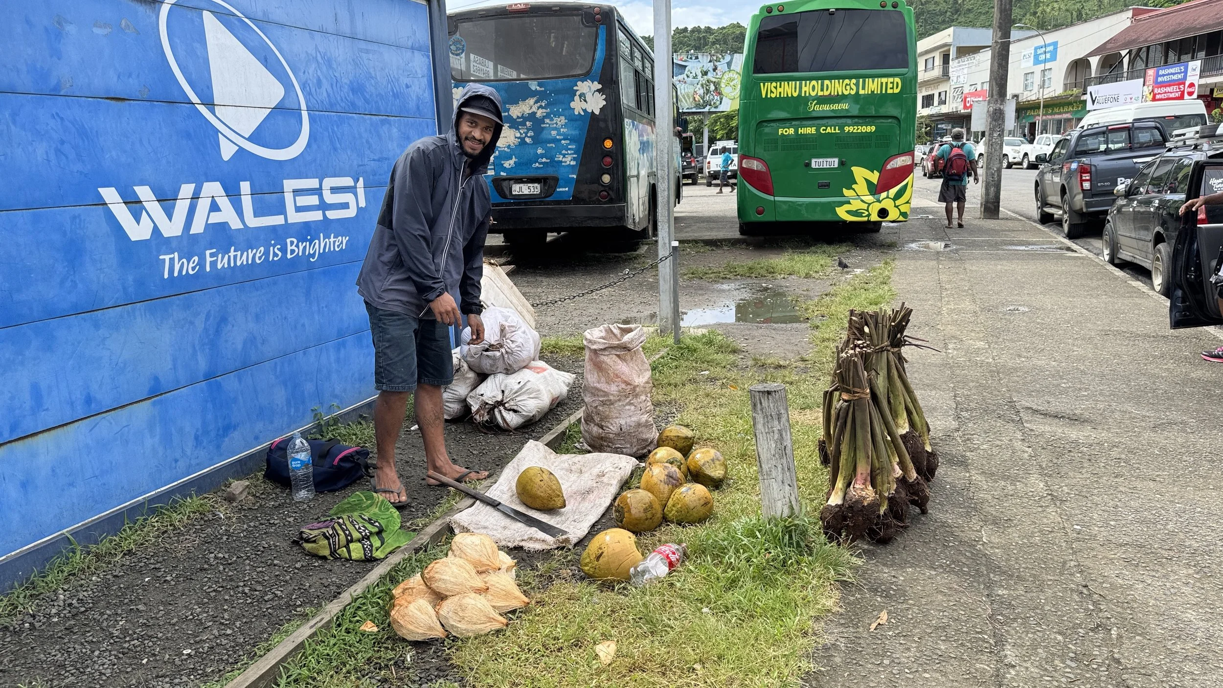 Selling coconuts and taro roots (on right side of photo) to bus passengers to take home to their villages