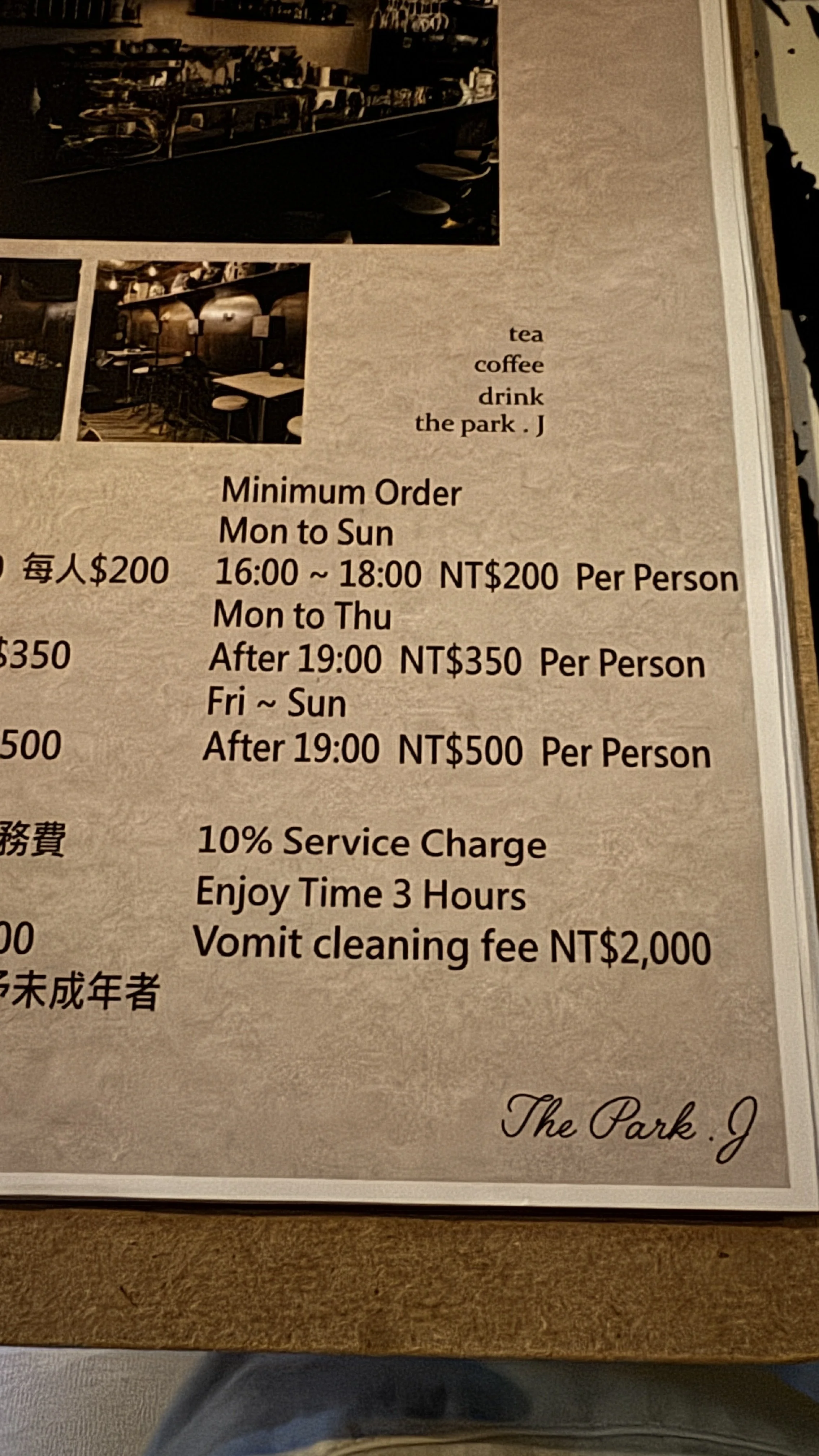 Many restaurants or bars have a minimum order fee (NT$100 = $3)