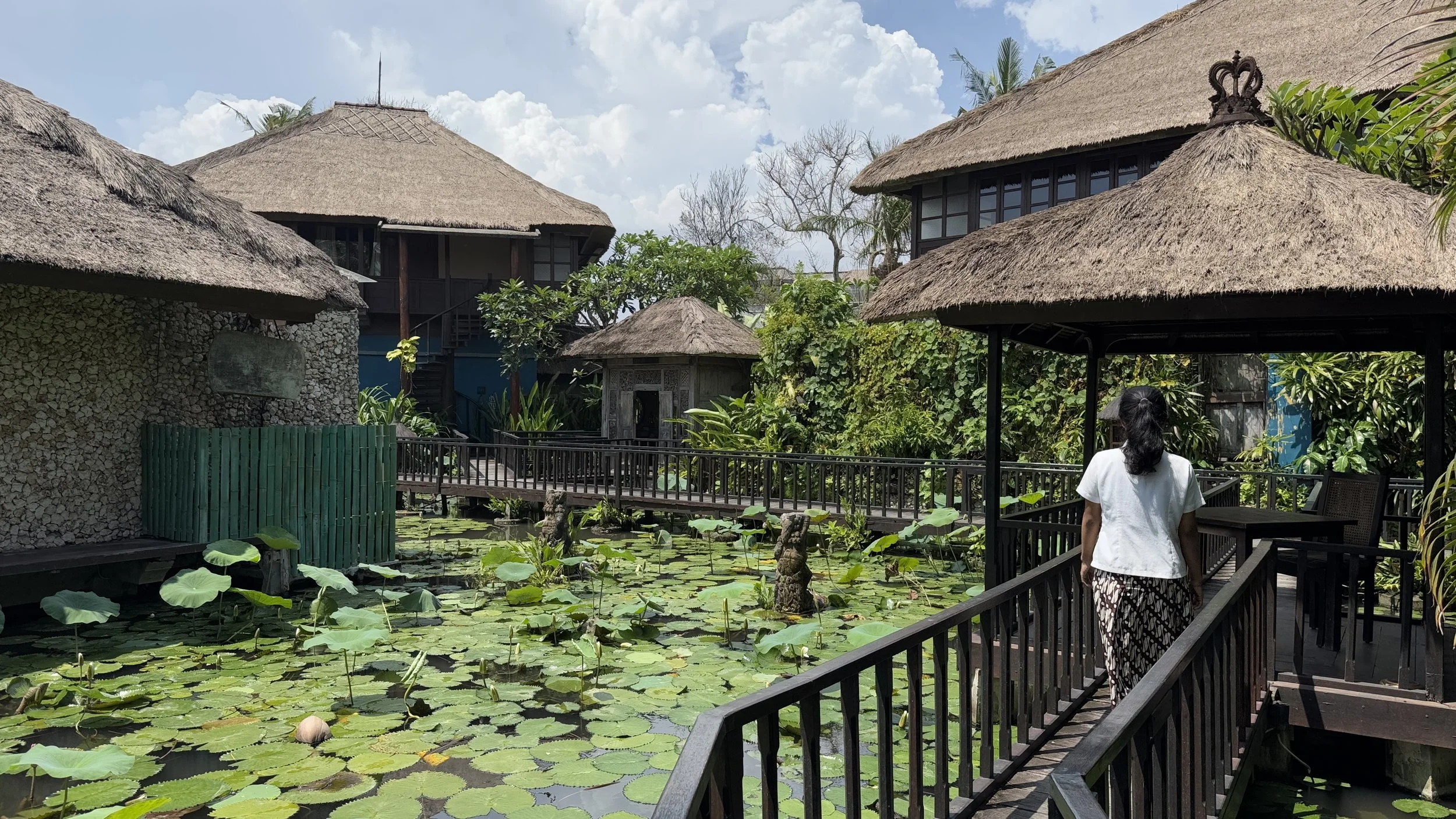 Randy had booked a cooking class and was very excited about it. It turned out to be in a nearly-hidden-from-the-street 5-star resort, Hotel Tugu Bali, a small, understated complex with lotus flower and koi ponds and villas connected with little stone bridges and wooden board walks. In one corner was an outdoor teaching kitchen in which we spent several hours prepping three outstanding dishes. We watched the hotel chef finishing the meals right in front of us.
