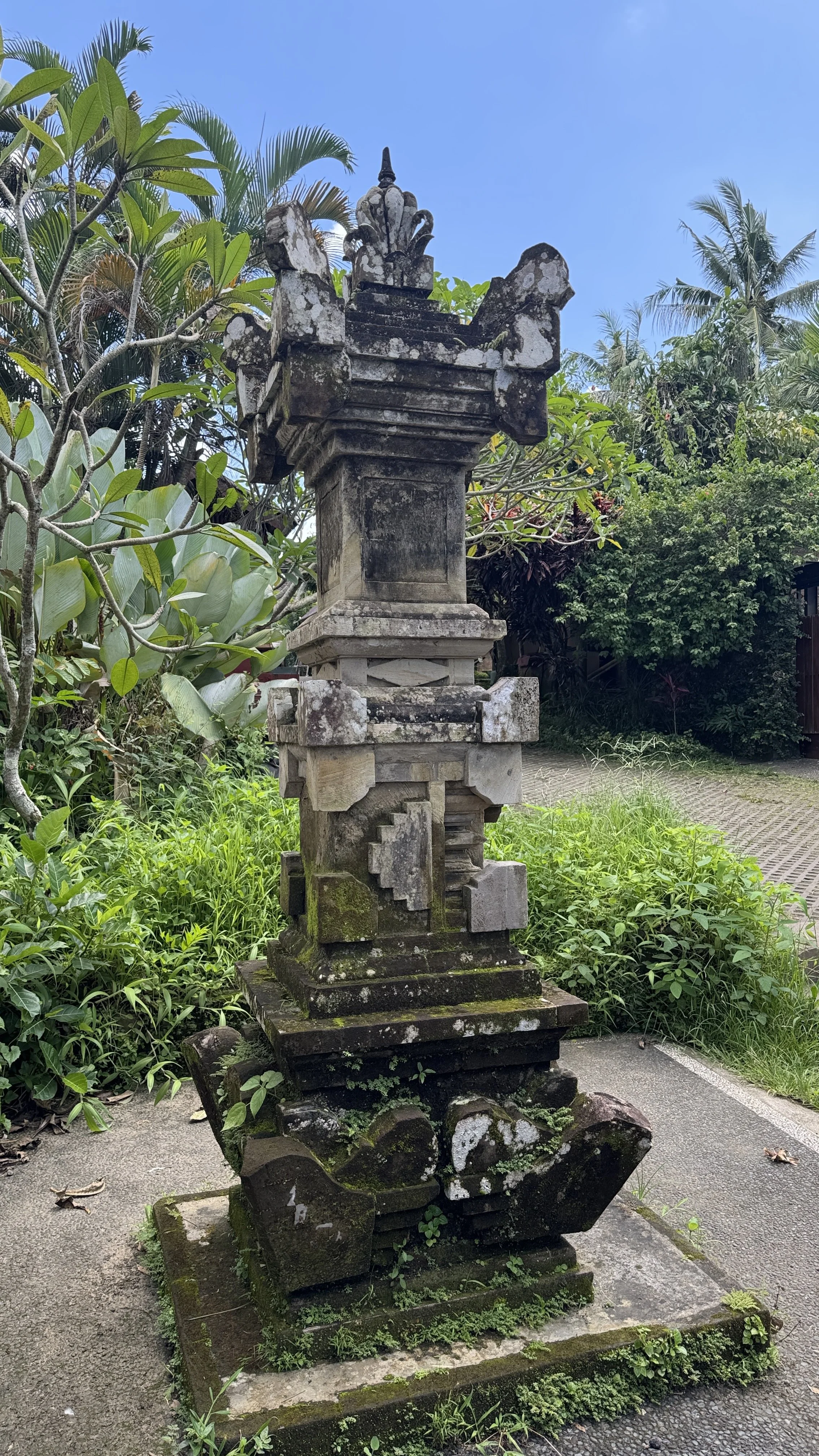 Then there are those Hindu shrines, elaborately carved stone columns, every 25 meters or so, where locals leave their daily offerings in woven banana leaf baskets (called Canang Sari) either on the statue or on the ground and usually filled with flowers and other small items like rice and snacks.