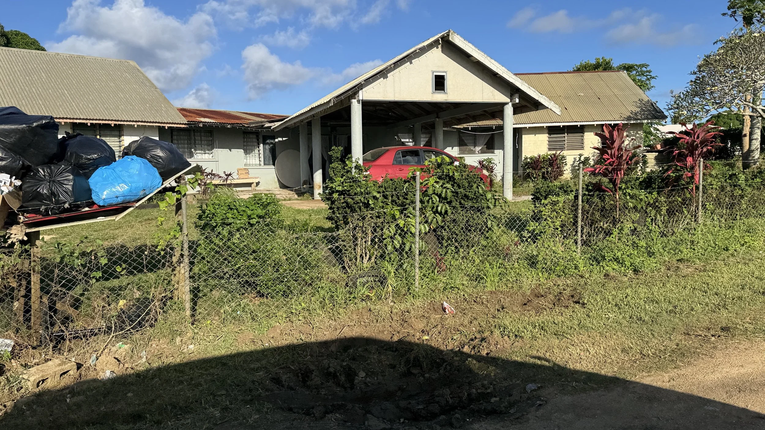 Typical Tongan family home. Note: on the left side the raised platform for garbage pick up to prevent the pigs and dogs from scavenging. This is typical throughout the South Pacific islands where animals roam freely.