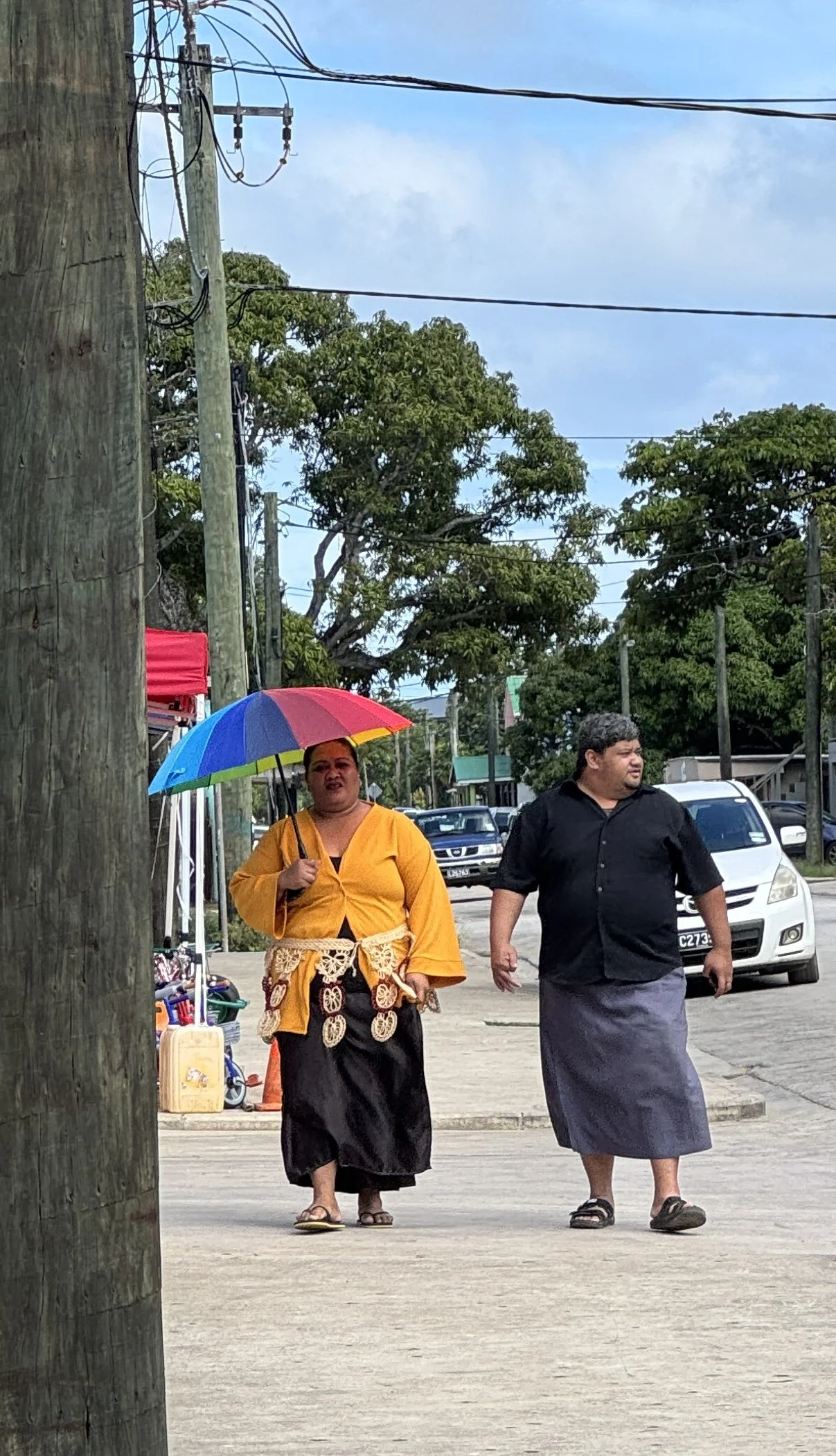 This woman is wearing a kiekie, a traditional Tongan girdle over a tupenu (wrap around skirt) which we have seen commonly worn in the capital city