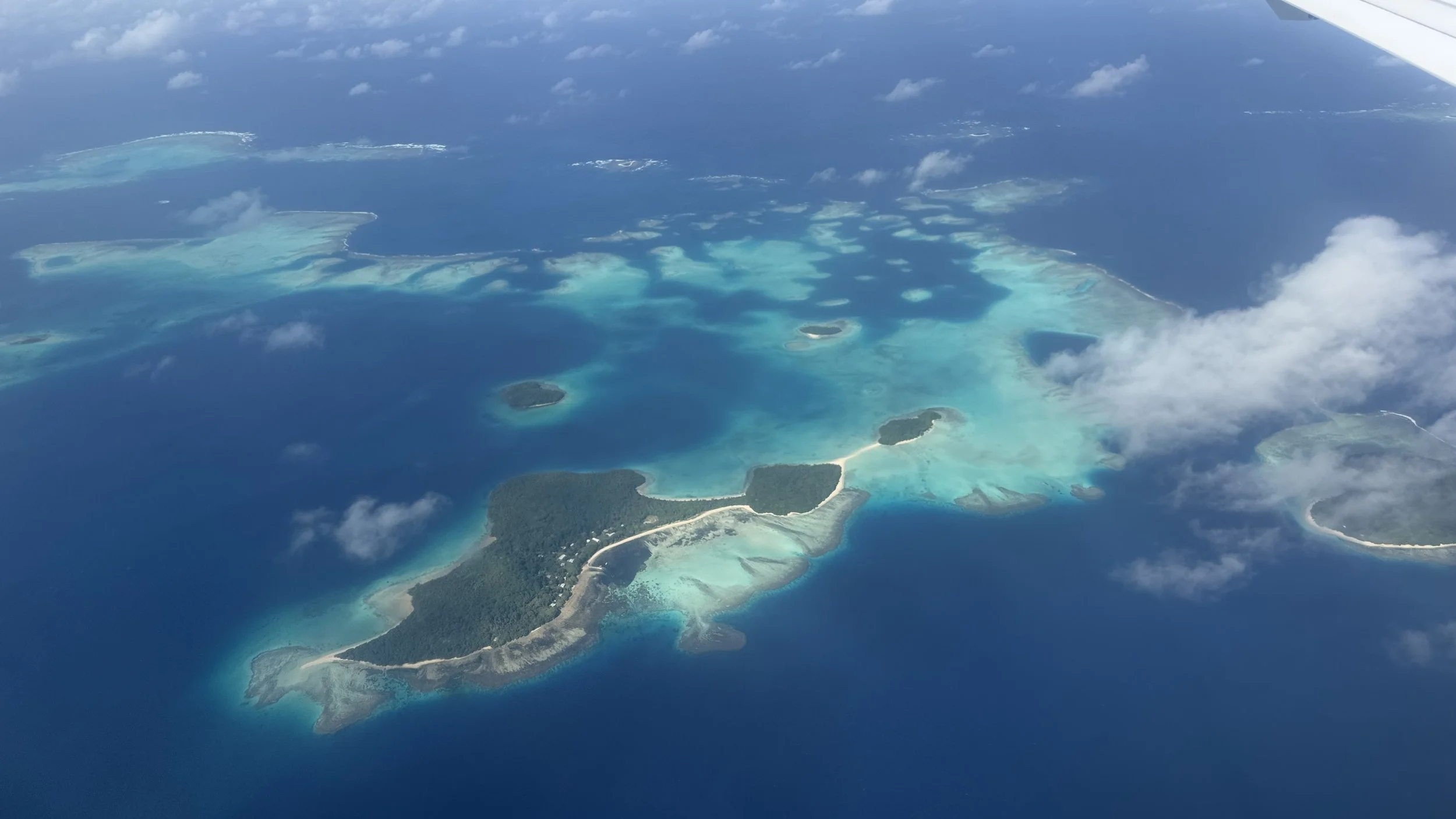 Beautiful turquoise aerial views flying over the islands of Tonga
