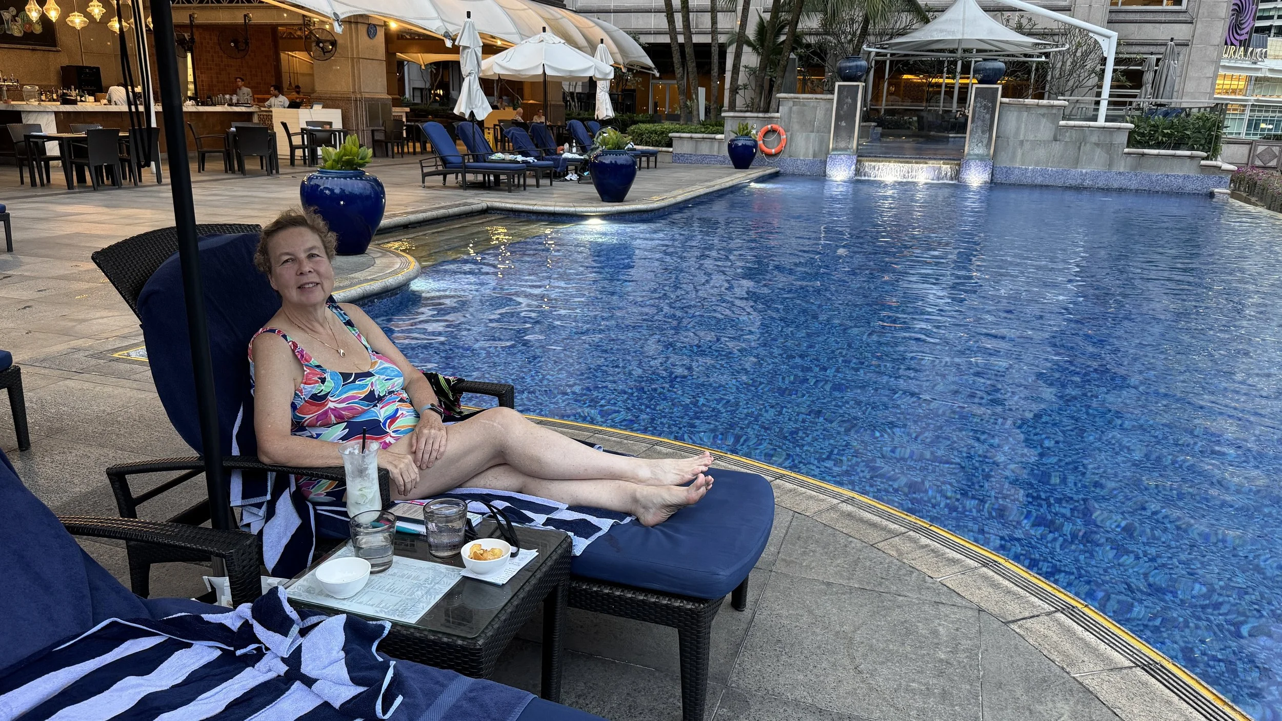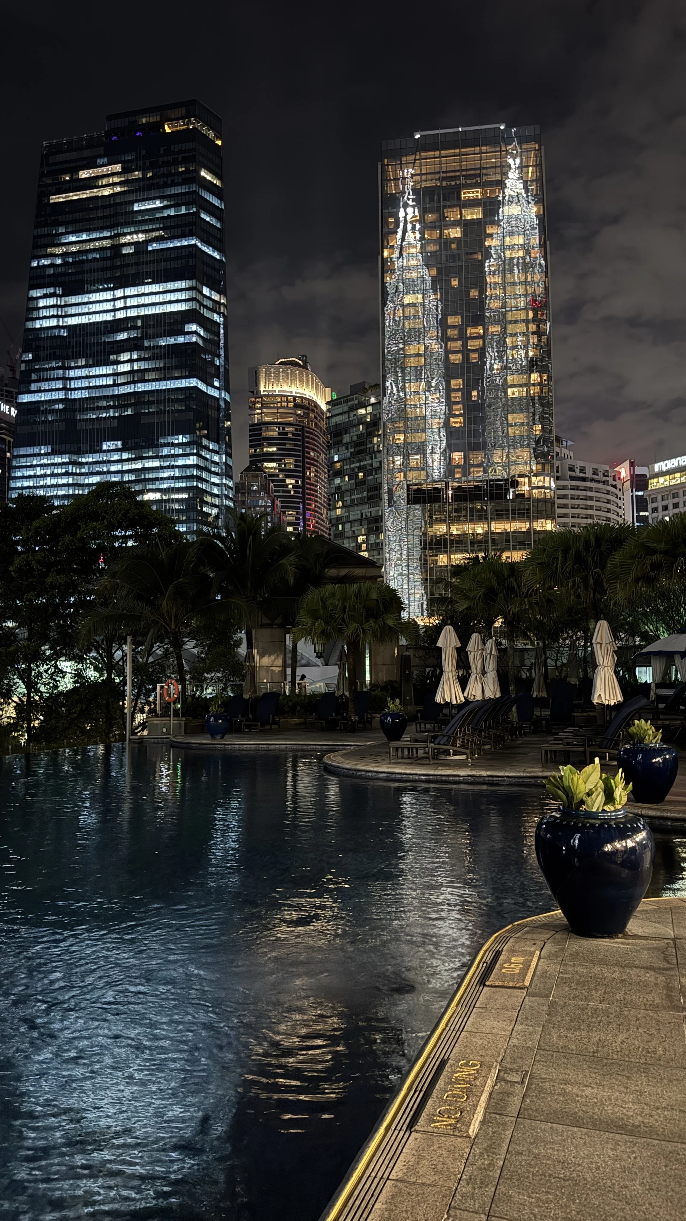 The pool at the Mandarin Oriental as twilight descends upon the city