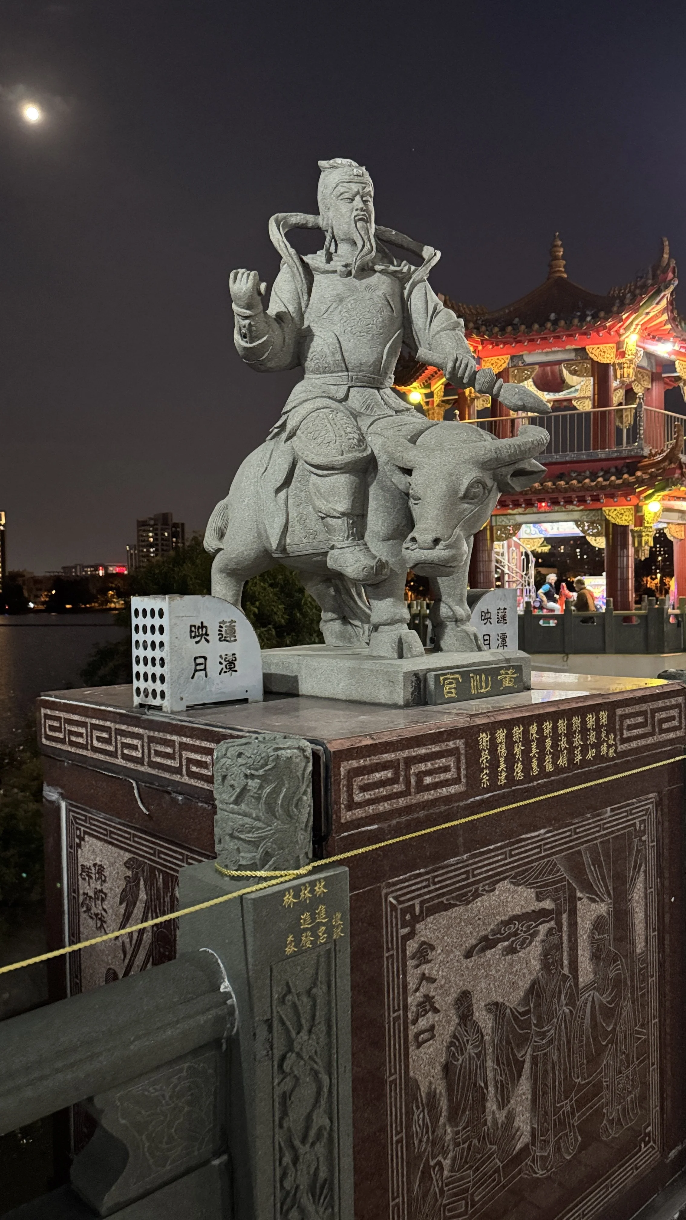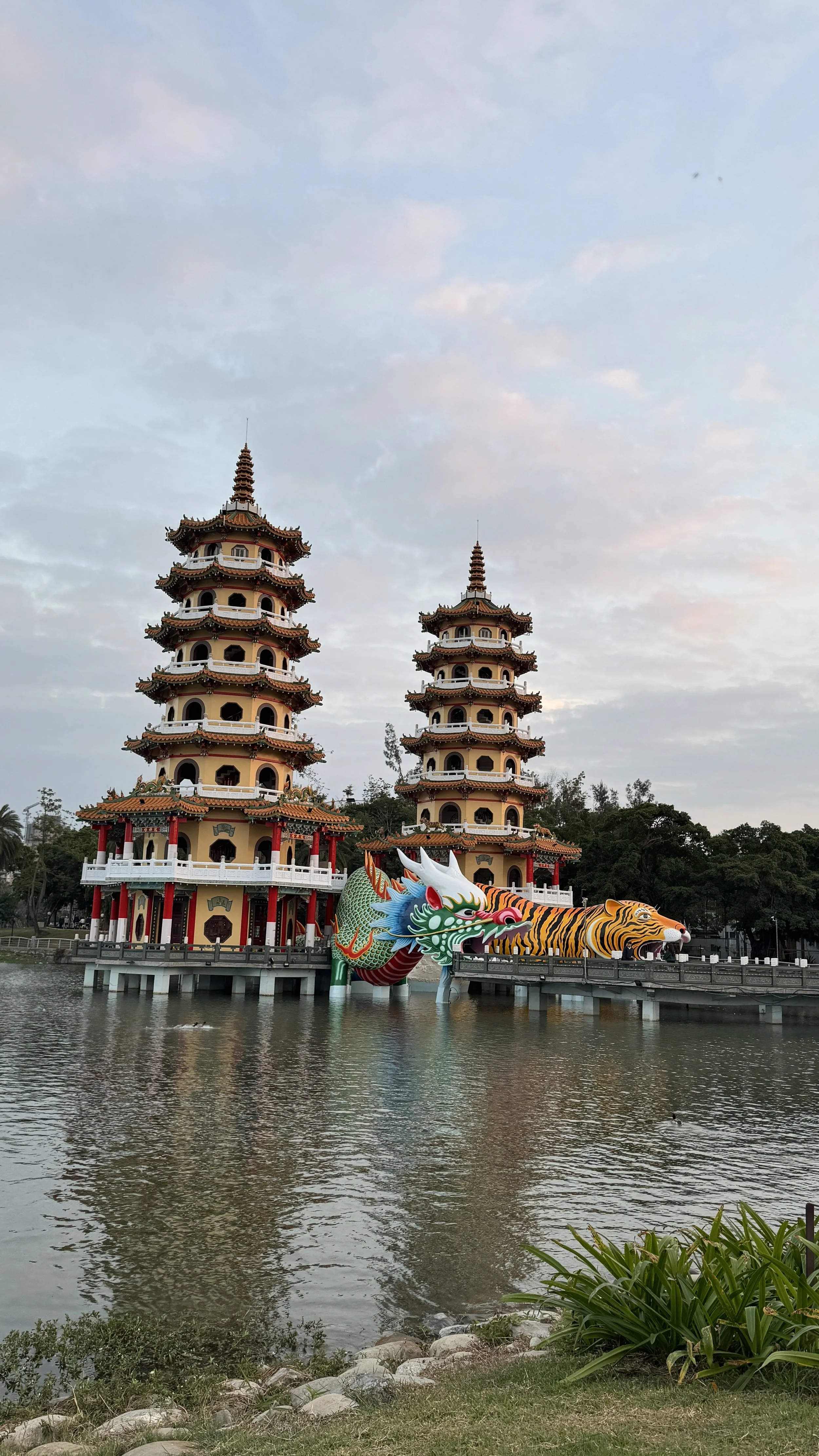 So, following her sage advice, we arrived at the lake around sunset and wandered around the shoreline for an hour as the sky darkened and the pavilions and pagodas lit up in the evening twilight. We enjoyed a relaxing stroll on the paths along the water’s edge. It was our last night in Kaohsiung and what a lovely way to spend it.